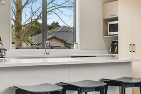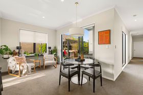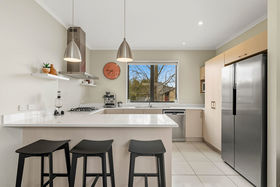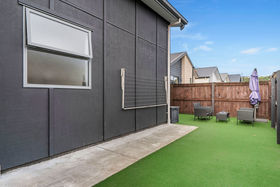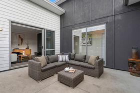 The minimalist, linear design with its skillion roof and edgy colour blocked exterior presents a home with immense street appeal enhanced by an attractively landscaped front yard. The tiled entranceway with eye catching timber batten wall steps directly into a sizable sitting and dining area. Ranch sliders stack back to reveal a private and sheltered central courtyard and alfresco cabana with space to relax outdoors and entertain friends around the barbecue. A gated zone nearby sits in an intimate nook which is the perfect spot for a spa - the ideal spot for a soak after an 18-hole day. The open plan kitchen is well equipped with stainless steel appliances, neutral toned cabinetry, composite stone benchtops and efficient gas hob top. A separate sitting room similarly flows to the courtyard and offers scope as a media retreat or quiet space when needed. Abundant storage throughout includes spacious built in closets in all three elegant bedrooms while two bathrooms includes ensuite to master and the other a practical combination of bathtub, shower, floating vanity and toilet. Multiple heat pumps are fitted throughout for snug and warm winters while the secluded backyard with Astroturf base is fully fenced for active dogs and wandering toddlers.